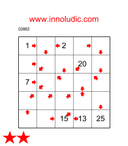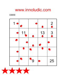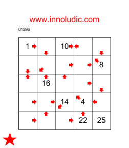 There are Arrows maze puzzles. The aim is to jump from one square to another in a grid to reach all the squares. To help you, the numbers (in the squares) indicate the order of the jumps. All you have to do is find the missing jumps. To help you, each square is marked with an arrow pointing in the direction of the next jump square. Go on, get to grips with these three grids.