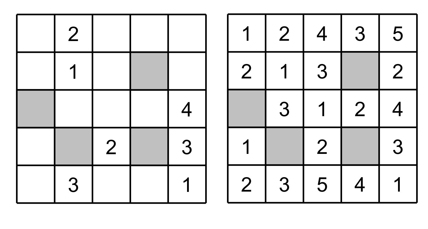 Le Yakazu est un croisement entre le Sudoku et les mots croisés. D’abord, comme les mots croisés, la grille contient des cases noires et comme au Sudoku, il faut entrer des nombres dans les cases. La grille contient des segments horizontaux et verticaux. Un segment est une suite de cases blanches consécutives. Un segment plus grand que 1 doit contenir les nombres de 1 jusqu’à N (N étant la longueur du segment). Au début, certaines cases sont remplies. Voici une grille avec sa solution.