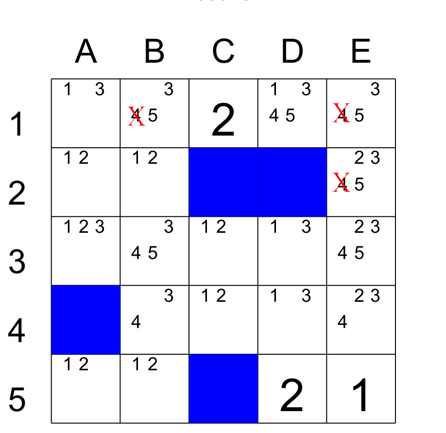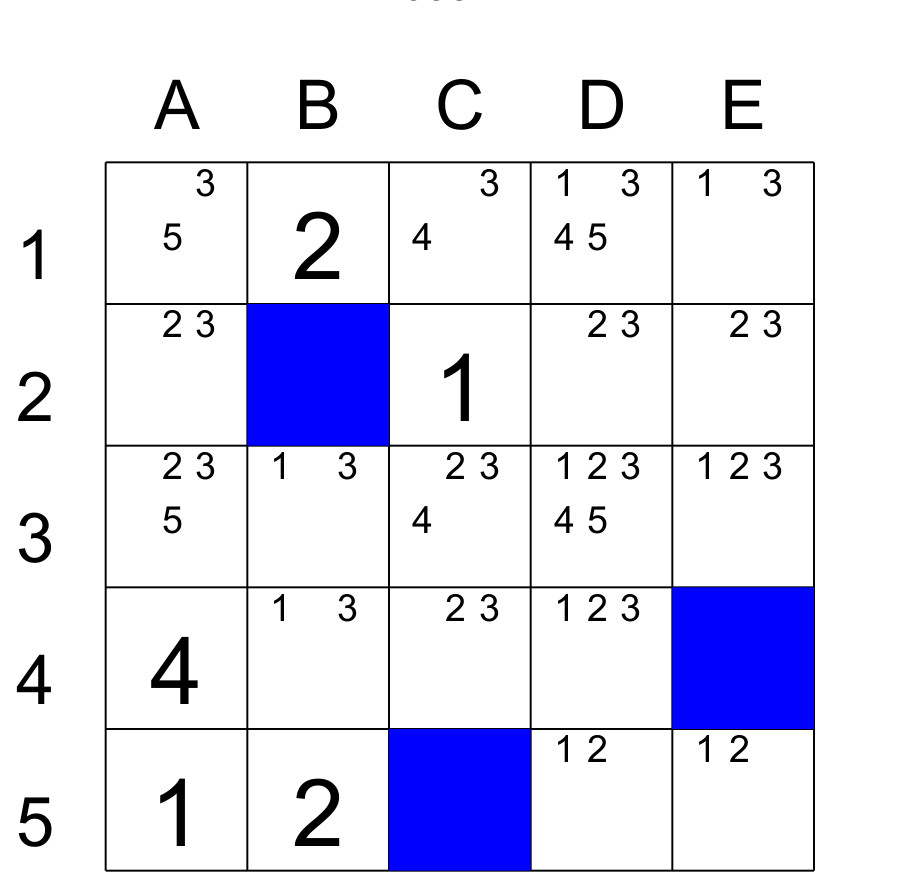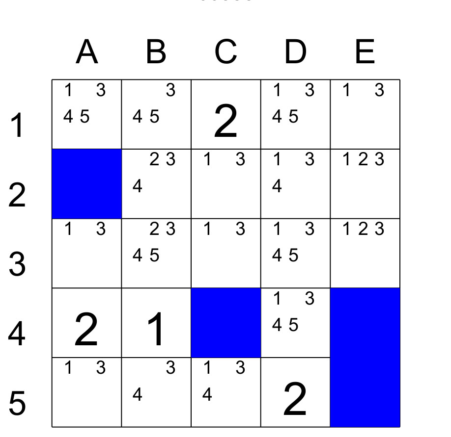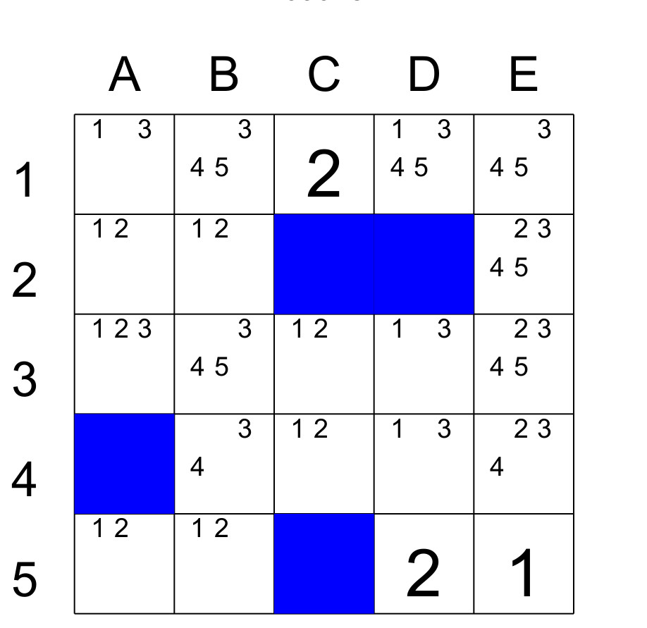La case C3 ne peut accepter ni 2, 3, 4 ou 5 alors seulement le 1 peut convenir. Ensuite, nous pouvons placer le 2 dans la case A5 car cette case est à la croisée de segments de taille 2 et 5 et comme il y a déjà un 1 dans le segment de 5 (la case E1) alors A5 aura 2 et par le fait même A4 aura 1.