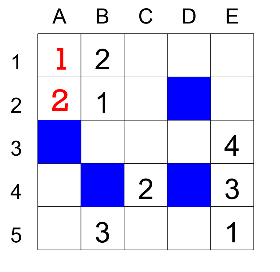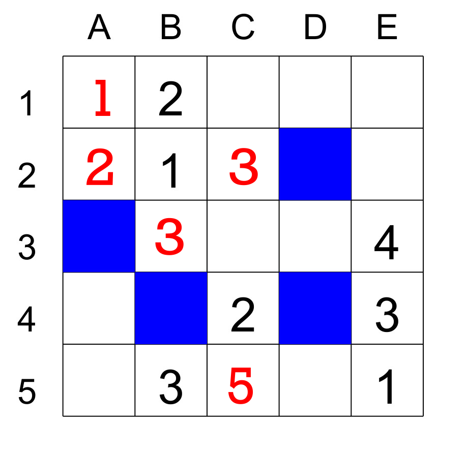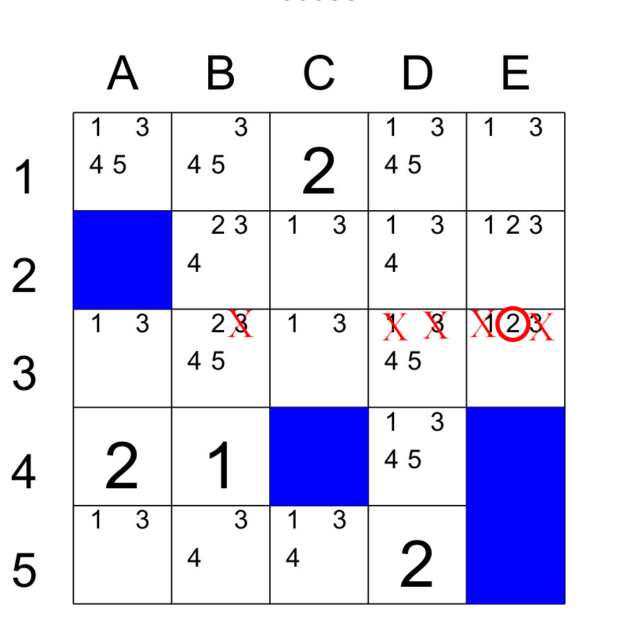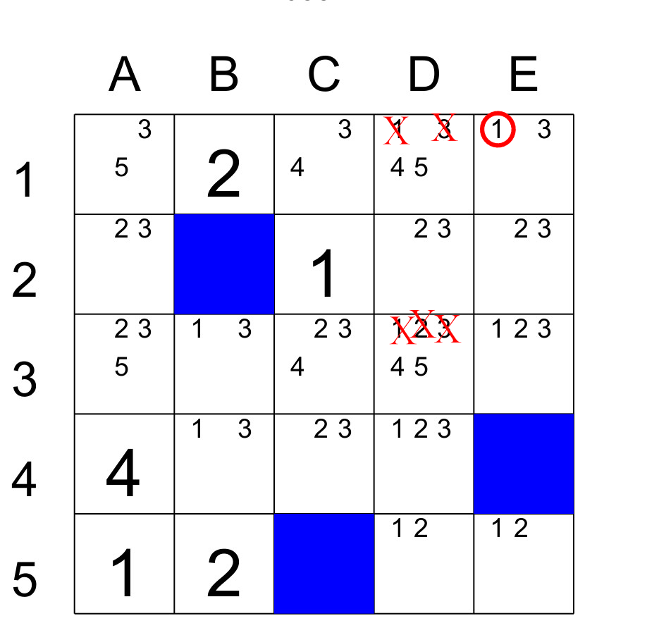 La case C3 ne peut accepter ni 2, 3, 4 ou 5 alors seulement le 1 peut convenir. Ensuite, nous pouvons placer le 2 dans la case A5 car cette case est à la croisée de segments de taille 2 et 5 et comme il y a déjà un 1 dans le segment de 5 (la case E1) alors A5 aura 2 et par le fait même A4 aura 1.