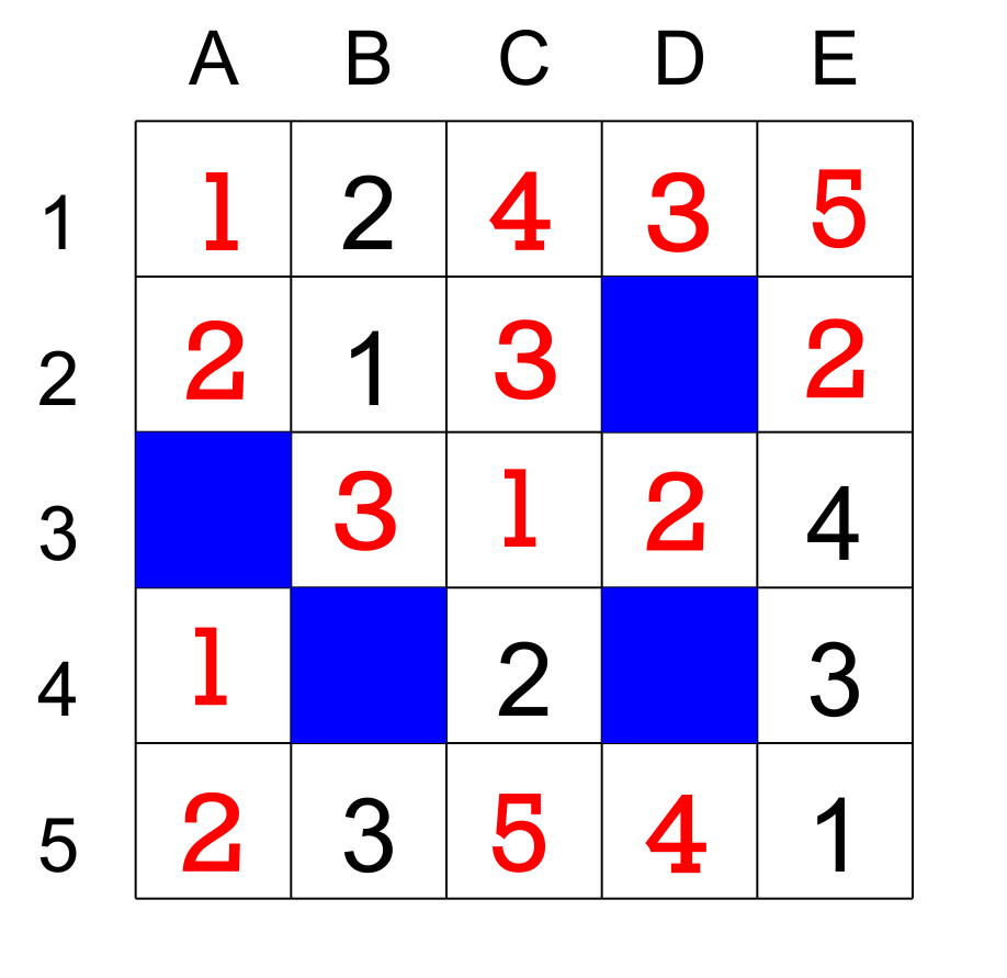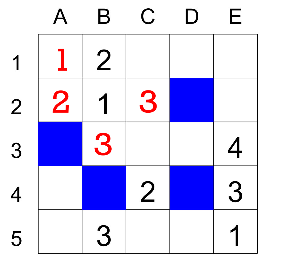 Comme on place les nombres dans un segment en fonction de sa taille, le segment horizontal de la rangée 1, qui contient 5 cases, contiendra les nombres de 1 à 5.  Le segment vertical en A1 et A2 a une taille de 2, donc il aura les nombres 1 et 2.  Comme la case A1 est commune à ces deux segments, cette case ne pourra jamais accepter de nombre plus grand que le plus petit segment à laquelle elle appartient, dans ce cas-ci : 2. Il y a une exception, si un segment a une taille de 1 (comme les cases E2, A4 et D5) la règle ne s’applique pas, il faut prendre la taille de l’autre segment de la case comme borne. Par exemple, E2, qui fait aussi partie du segment vertical de taille 5 sur la colonne 5, pourra accepter seulement les nombres 2 et 5  ce dernier segment contient déjà 1,3 et 4.