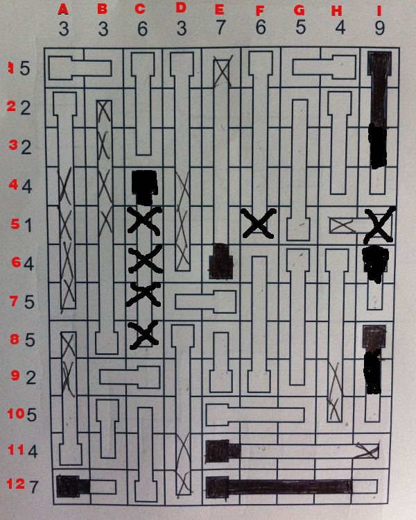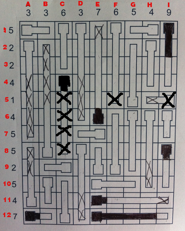 La case C5 pleine alors la case C4 aussi doit l'être, en éliminant toutes les autres case de la rangée 5 cela force les thermomètres en G a être vide et celui en F aussi (du moins le haut) .Donc maintenant la rangée 4 a 3 cases libres pour trois degrés, ce qui signifie que les cases libres (F4,H4 et I4) de la rangée 4 seront pleines. Ce qui signifie que les 3 thermomètres de ces cases devront avoir les cases F3,H3 et I3 pleines et donc que la capacité de la rangée 3 sera dépassée car elle ne peut contenir que 2 degrés de mercure. De ce fait nous pouvons éliminer la case C5 et par le fait même C6,C7 et C8 (figure 5).