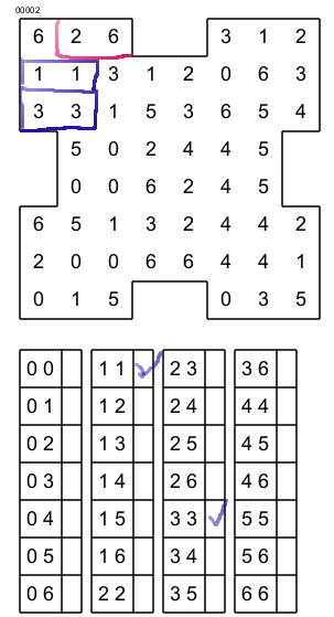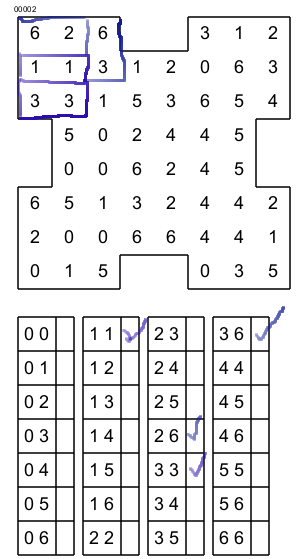 Éssayez d'abord de trouver l'emplacement d'un domino choisi dans la grille., Par example si l'on essai de trouver le domino 0,0 on s'apercoit qu'il peut aller dans deux endroits différents ( encerclé en bleu).