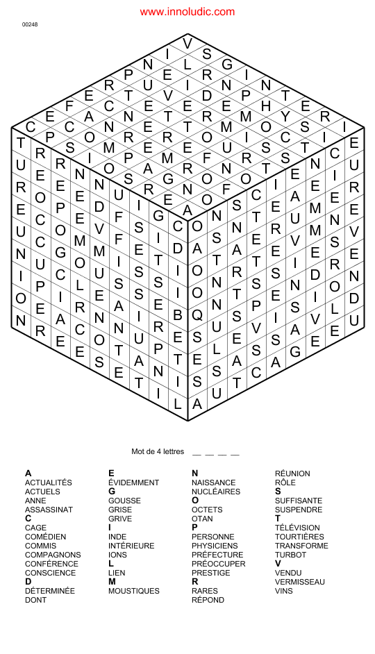 Voici un mot caché 3D, la grille où trouver les mots est un cube (au lieu d'être un rectangle), les mots s'étendent dans tous les sens sur les trois faces du cube. À la fin les lettres restantes forment le mot caché. Je ne vous pas plus languir, je vous présente un Mot caché 3D sur un cube de 9x9x9.