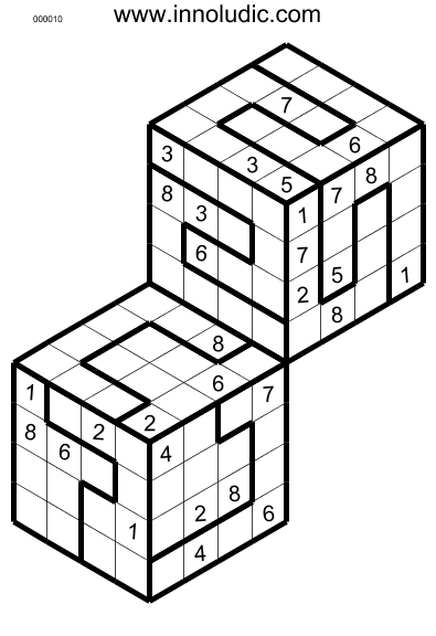 Voici un Hyper Sudoku 3D (Règles du Sudoku 3D) de taille 4x4x4. Les régions sont de forme irrégulière au lieu d'être simplément rectangulaire. Il faut utiliser les nombres de 1 à 8. La particularité de ce jeu est que sur chaque cube une colonne ou rangée s'etend sur deux faces différentes du même cube. Mais lorsque deux cubes se touchent, comme dans ce jeu, alors des colonnes et rangées suplémentaires sont créées par ces deux faces de cubes différents.