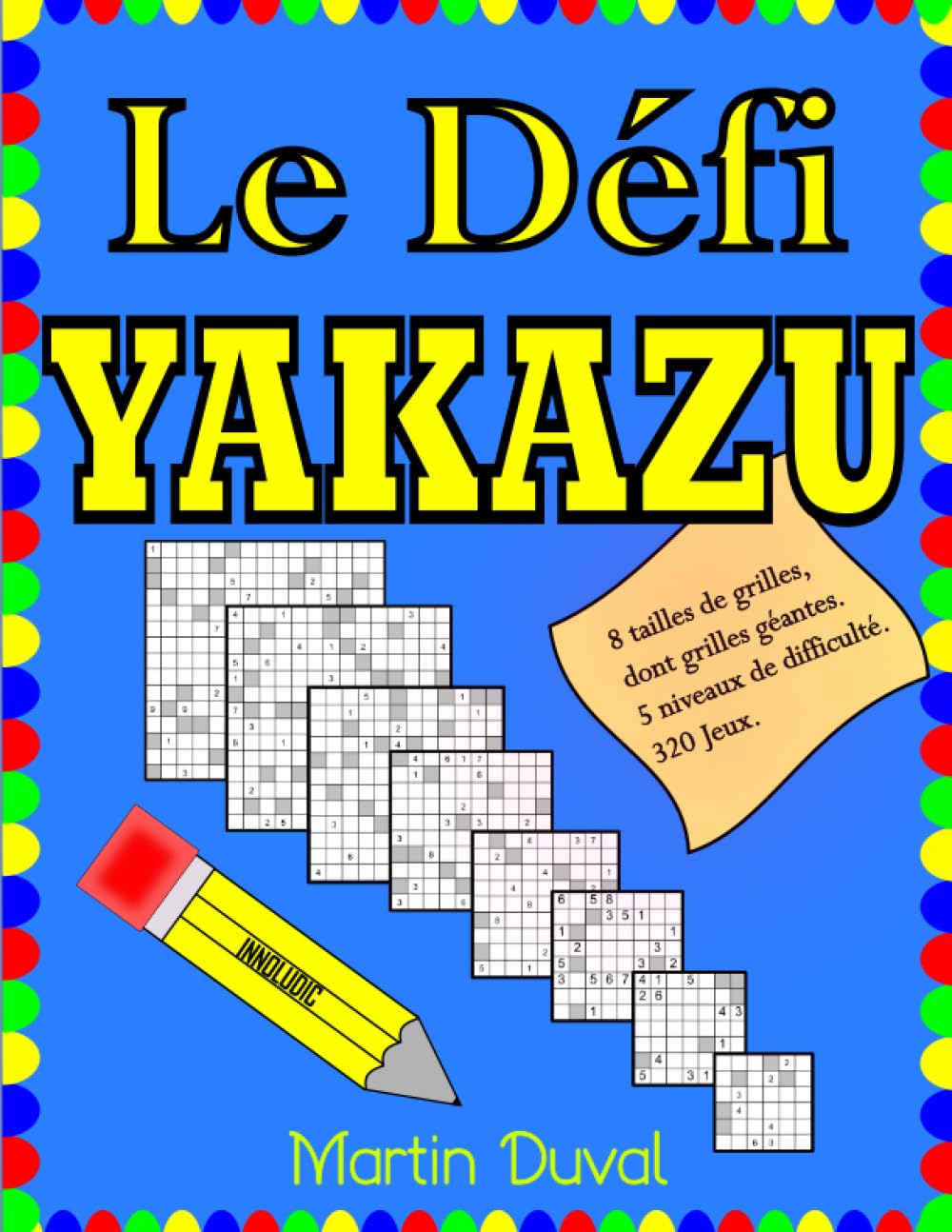 Le Yakazu (Règles du Yakazu) est un nouveau jeu venu de la France du créateur Patrick Tirone. Lorsque j’ai essayé le Yakazu j'ai ressenti la même expérience que lorsque j'ai découvert le Sudoku presque 20 ans plus tôt. C’est-à-dire un délicieux ensorcellement intellectuel qui s’entremêle avec une forte attraction à vouloir résoudre ce jeu qui nous tient captifs. J’ai donc décidé de faire un livre qui explore le Yakazu. Le déif yakzu contient 320 grilles de toutes tailles. Là où les autres présentent des grilles de taille maximale de 9x9, j’y ajoute des grilles de tailles géantes de 10x10,12x12,14x14 et 15x15, mais toujours avec des segments taille 9 ou inférieure (on ne peut jamais entrer de nombre plus grand que 9). À ma connaissance je suis le seul à vous offrir des grilles de Yakazu de tailles géantes.