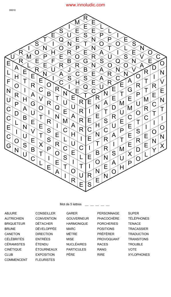Récemment je vous ai présenté le Mot Caché 3D. J’ai ajouté un article pour décrire les particularités de ce jeu (Règles du Mot Caché 3D). En fait, il s’agit d’un Mot Mélé sur une grille en forme de cube. IL faut trouver tous les mots de la liste dans la grille. À la fin les lettres restantes forment le mot caché. Le Hic c’est que la grille n’est pas rectangulaire, donc la manière dont les mots sont inscrits sur la grille peut paraitre un peu déroutante de prime abord. Mais une fois habitué, vous aimerez cette formule. Voici une grille de 8x8x8.
