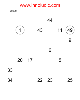 Après vous avoir présenté des jeux d'Hidoku exotique, il est bon de revenir aux sources. Voici donc deux Hidoku classiques (Régles du Hidoku). Le but est simple: tracer un chemin partant de la première case jusqu'à la dernière case (celle dont le nombre, autre que 1, est encerclé). Le chemin passe de case en case (le mouvement se fait horizontalement, verticalement ou diagonalement, une case à la fois). Des cases sont numérotées, elles representent les numéros de pas du chemin.