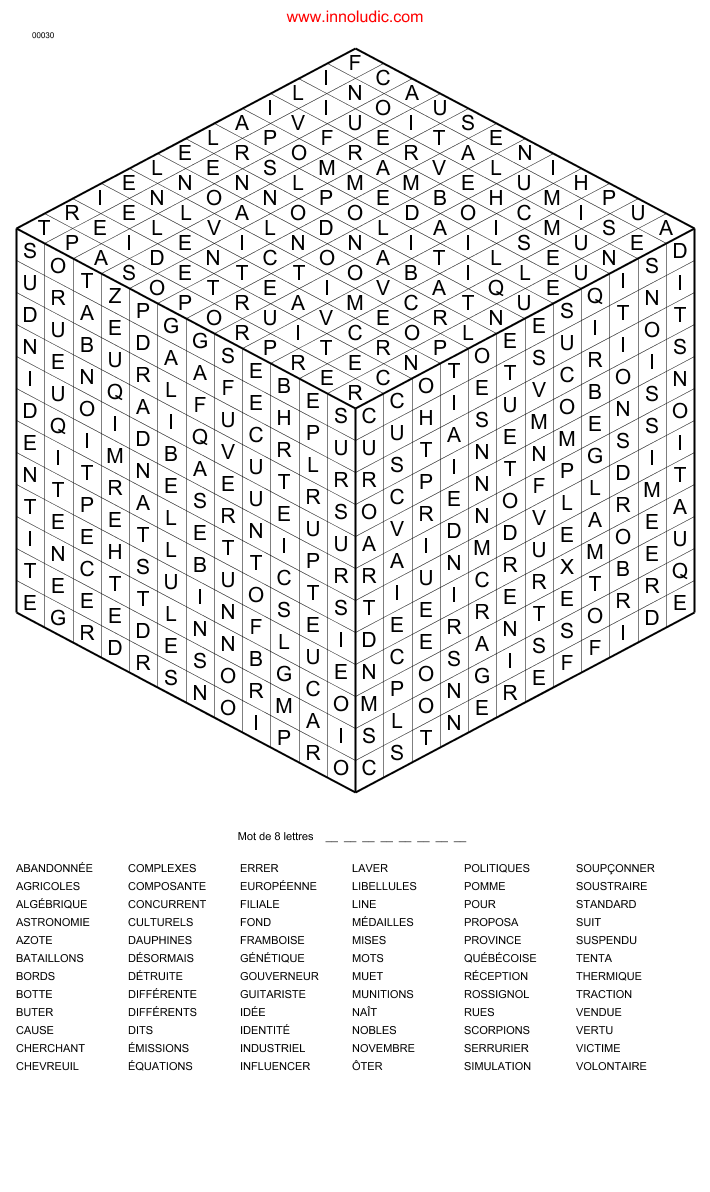 Il faut trouver dans la grille, en forme de cube, tous les mots de la liste. Les 8 lettres restantes forment le mot caché. Bien entendu, les mots vont dans tous les sens (Mais toujours en ligne droite). Il se peut qu’un mot puisse s’étendre sur deux ou même sur les trois faces du cube (dans ce dernier cas, le mot est en diagonale). De plus un mot dans la grille peut partager une ou plusieurs lettres avec d 'autres mots.