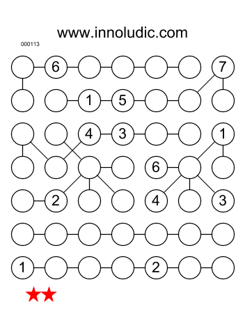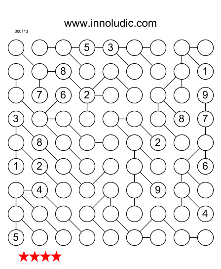 Voici deux jeux de Sudoku Chaine ( Règles du Sudoku Chaine). Dans le premier, de taille 7x7, utilisez les nombres de 1 à 7 tandis que pour le deuxième, lui de taille 9x9, utilisez les nomnbres 1 à 9. Voilà, tout est dit, il ne vous reste plus qu’à vous confronter à ces jeux. Brièvement il s’agit de placer tous les nombres de 1 à X dans chaque rangée, colonne ou région. Les régions sont tous les cercles qui sont reliés ensemble. Bon plaisir !.