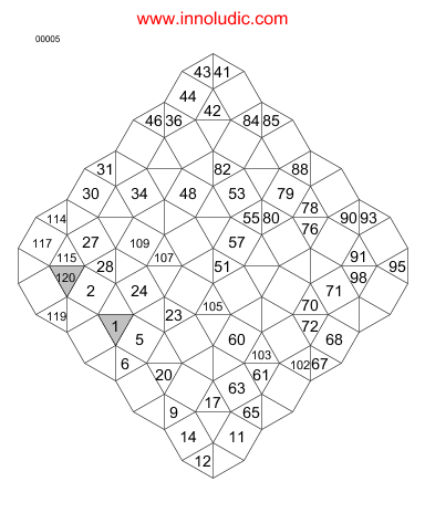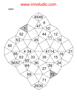 Comme pour tous les Hidoku il faut trouver un chemin qui part de la première case jusqu’à la dernière (les cases en gris) en visitant toutes les cases. Le chemin passe d’une case à l’autre uniquement si l’autre case touche a un des coins de la case initiale. Dans ce cas-ci une case triangulaire peut avoir 9 cases accessibles et une case carrée peut en avoir 12. Finalement, les chiffres qui apparaissent dans certaines cases indiquent l’ordre de la case dans le chemin. (Régles du Hidoku)