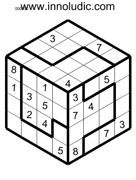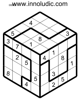 Voici deux jeux de Sudoku 3D Chaos (Règles du Sudoku 3 Dimensions). Pour ceux habitués aux Sudoku conventionnels il peut être déroutant de voir le Sudoku 3D. En fait les colones et rangées commencent sur un face du cube et se terminent sur la face adjacente. De plus les régions sont de forme irrégulière.