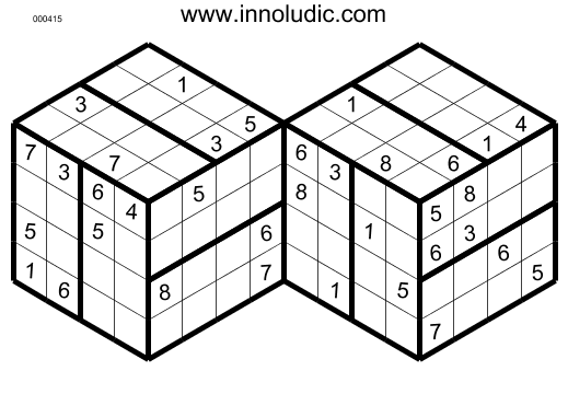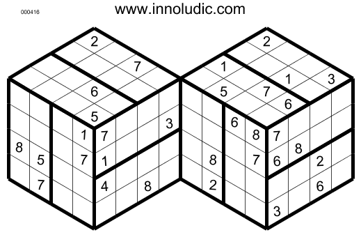 Voici deux jeux d'Hyper Sudoku 3D (Règles du Sudoku 3D) de taille 4x4x4, il s'agit de deux cubes superposés avec régions irrégulières, il faut utiliser les nombres de 1 à 8. La particularité de ce jeu est que les colonnes et rangées occupent deux faces d'un cube et que de plus certaines colonnes et rangées occupent aussi deux faces de deux cubes différents lorsque deux cubes se touchent.