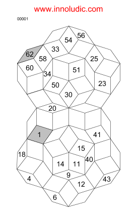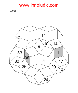 Je continue d’explorer les grilles de Hidoku, cette fois j’essaie la grille de Penrose composée de losanges avec les particularités du pavage de Penrose. Je vous présente une grille simple et une double. N’oubliez pas qu’à partir d’une case toutes les cases dont un des coins touche à un coin de la case initiale peuvent être accéder. Dans chaque jeu, la première et dernière case sont grises. Les règles usuelles du Hidoku s’appliquent (Régles du Hidoku)