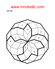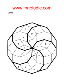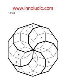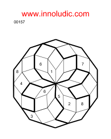 Je vous présente une de mes dernières créations: le Sudoku Décagone (Règles du Sudoku Décagone). Il s'agit d'un Sudoku dans une grille décagonale (un polygone de dix cotés). Il contient 20 lignes et 5 régions de 8 cases, il faut donc entrer les nombres 1 à 8. Comme la grille n'est pas rectangulaire, les cases sont des losanges de différentes formes. Donc les lignes ne sont pas rectilignes, car elles sont composées de losanges de formes disparates. Voici un jeu avec sa solution: