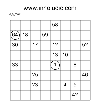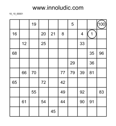 Je présente un nouveau jeu le Hidato, en fait j’avais commencé en en faire en 2008, mais c’est la première fois que je vous le présente. Je l’ai dépoussiéré ces derniers mois et je me suis aperçu qu’il pouvait être très polyvalent aussi bien dans sa forme que son fonctionnement. Je vous le présente donc aujourd’hui dans sa forme habituelle. Pour les autres variations, cela sera plus tard. Voici un Hidoku et sa solution