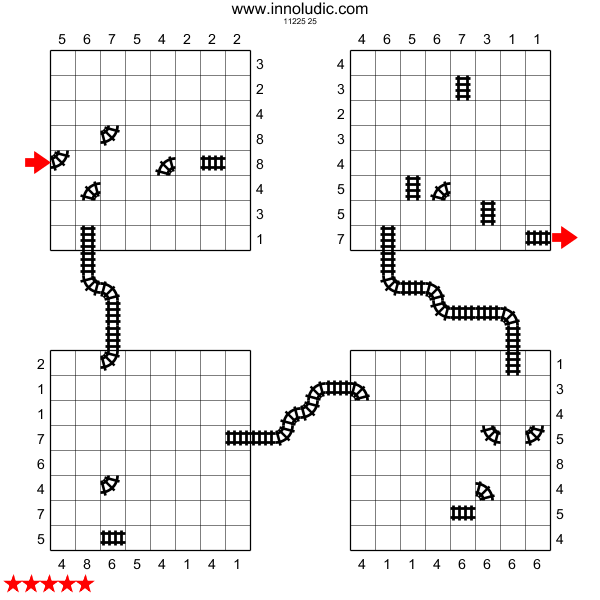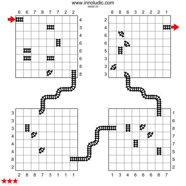 Voici deux jeux de Chemin de Fer Multiple composés de quatre grilles 8x8 (Règles du Chemin de Fer). Il faut completer la voie ferrée qui traverse les quatre grilles (selon le sens des flêches), tenez compte des nombres autour de la grille qui indiquent le nombre de cases de la colonne ou rangée correspondante où le chemin passe.
