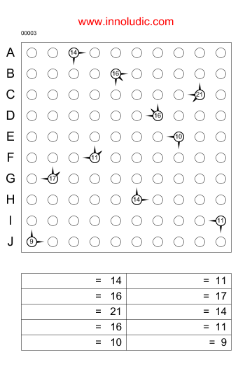 Dans une grille, il y a un vaisseau dans chaque rangée et colonne qui ont chacun un niveau d’énergie. Le but est de la location de chaque vaisseau ainsi que leur niveau d’énergie. Les nombres qui apparaissent dans certain cercles indiquent le total d’énergie des vaisseaux qui sont pointés par les flèches. Il faut donc procéder en deux temps 1) Trouver l’emplacement des vaisseaux et 2) trouver leurs niveaux d’énergie. Pour le dernier point, aidez-vous du tableau sous la grille et les lettres des rangées pour déduire le niveau d’énergie de chaque vaisseau en faisant un peu d’algèbre.