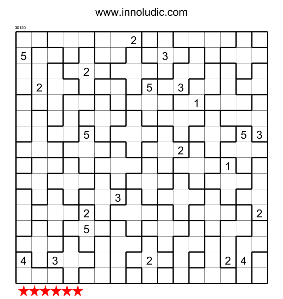 Le Suguru (Règles du Suguru) peut facilement prendre plusieurs tailles. Par contre pour des grilles de taille plus imposantes comme des grilles 15x15 et plus. La difficulté est que plus la grille est grande plus il est difficile de respecter la règle d'avoir des régions de taille maximun de 5 cases. Cette règle assure une certaine uniformité, car jamais il y a un nombre supérieur à 5 à entrer dans une case. Toutes les revues de Suguru respectent cette règles. Tous les Suguru que je présente respectent cette règles, en voici un de taille 16x16.