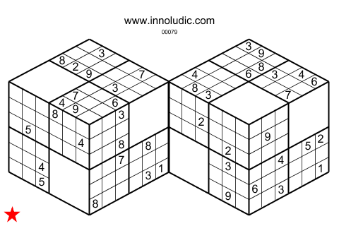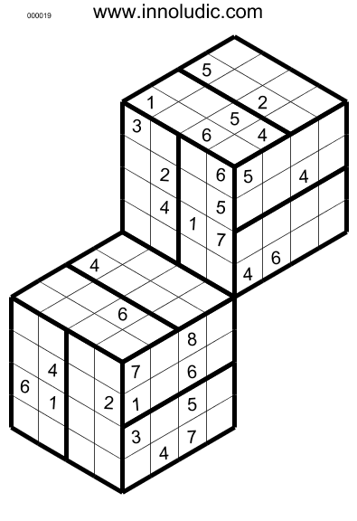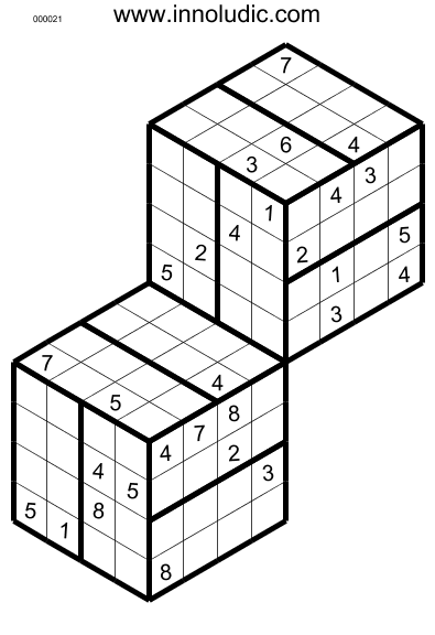 Voici deux jeux d'Hyper Sudoku 3D (Règles du Sudoku 3D) de taille 4x4x4, il s'agit de deux cubes superposés, il faut utiliser les nombres de 1 à 8. La particularité de ce jeu est que les colonnes at rangées occupent deux faces d'un cubes et que de plus certaines colonnes et rangées occupent aussi deux face de deux cubes différents.