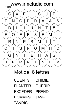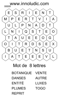 Après les péripéties des derniers jours, il est bon de revenir à nos moutons et de présenter des jeux. Voici donc deux jeux de Mots Abeille (Règles des Mots Abeille) pour vous servir. Le but est simple : il suffit de trouver un mot caché dans une grille, pour ce faire vous devez identifier dans la grille tous les mots d’une liste qui apparait sous la grille. À la fin, les lettres restantes forment le mot caché. La particularité est que comme la grille est composée de cases hexagonales alors les mots au lieu de tout sagement suivre une ligne droite suivent des sinuosités formées par l’emplacement des lettres dans les cases.