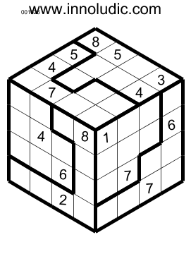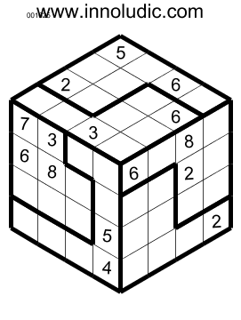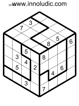 Voici trois Sudoku 3D avec régions irrégulières (Règles du Sudoku 3D). Le Sudoku 3D déroutera celui ou celle qui ne connait que le Sudoku standard avec ses colonnes et rangées rectiligne. Pour le Sudoku 3D les choses sont différentes, tout d'abord les colonnes ou rangées commencent sur une face pour ensuite bifurquer et se terminent sur la face adjacente du cube. Et comme si ce n'était pas assez, les régions sont de formes irrégulières au lieu d'être bien sagement rectangulaire.