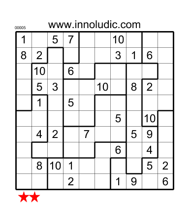 Voici un Sudoku Chaos de taille 10x10. Comme pour le Sudoku classique il faut que cahque rangée, colonne et région contiennent tous les chiffre sans se repeter. La différence c'est qu'il y a 10 rangées, colonnes et région de ce fait il faut utiliser les nombres de 1 à 10é De plus les région (comme dans tout bon Sudoku Chaos) ont des formes irrégulières. Allez.. Attaquez-vous a cette bête.