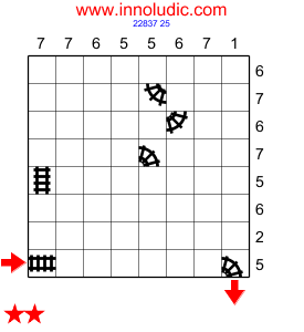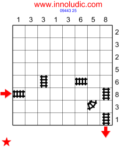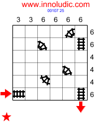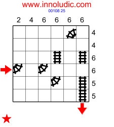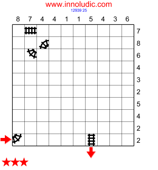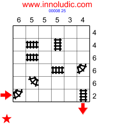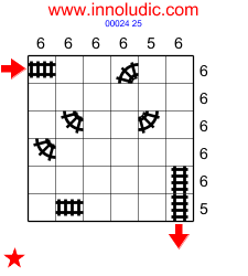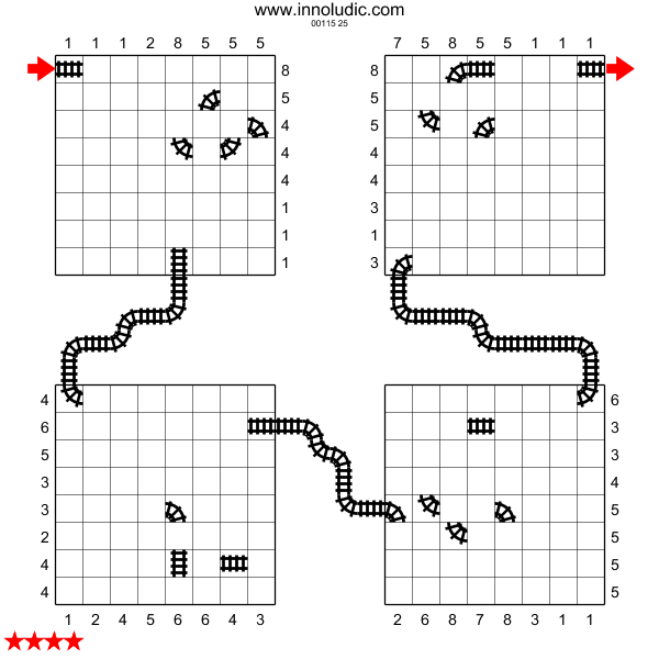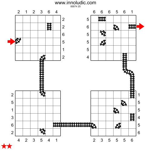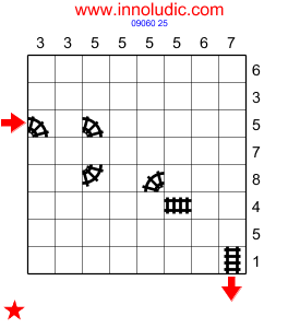 Ce jeu est connu sous le nom Train Tracks . Il est plutôt connu du chez les Britanniques. Il s’agit d’un jeu de logique visuel qui est simple, mais qui n’en recèle pas moins beaucoup de subtilités, bref de quoi vous plaire. Le but est simple, il faut tracer un chemin de fer dans une grille qui va d’une flèche à l’autre. Le train passe d'une case à l'autre soit en ligne droite ou en tournant. Comme indices de départ, il y a déjà certains rails d’indiqués dans la grille et de plus autour de la grille il y a des nombres qui indiquent le nombre de cases avec des rails qui sont dans les rangées ou colonnes correspondantes. Attention !! il ne faut jamais que le chemin de fer se croise.