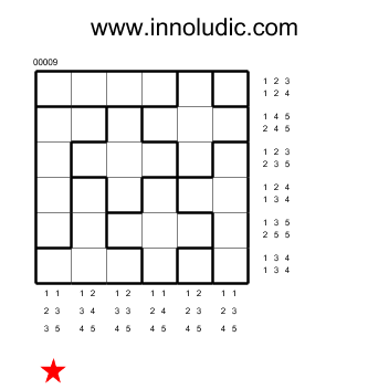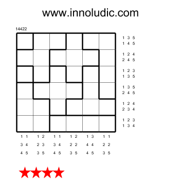 La semaien dernière je vous ai proposé le Sudoku Outside, maintenant c'esr le temps du Suguru Outside. La grille ne contient aucun indices, ceux ci sont situés à l'exterieur, en fait les chiffres devant les colonnes at rangées indiquent qu'ils sont présent dans les dites rangées ou colonne. QUand vous trouvez un chiffre dans la grille rayez le dans les indices aussi bien de la colonne que de la rangée. Voici donc un jeu facile et l'autre un peu moins.