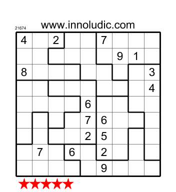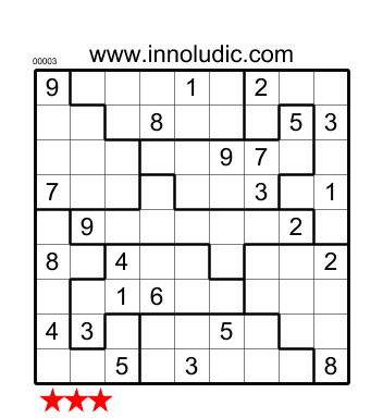 Voici duex Sudoku chaos pour égayer vos journées. Cela est exactement pareil a un Sudoku standard il faut plcar dans chaque ligne, colonne er région les nombre de 1 à 9. La seul différence est que les région ne sont plus des boites de 3x3 mais sont des formes les plus extavagantes. Cett différence est suffisante en soi pour vous stimuler car il n'y a pas deux Sudoku chaos qui ont la même forme.