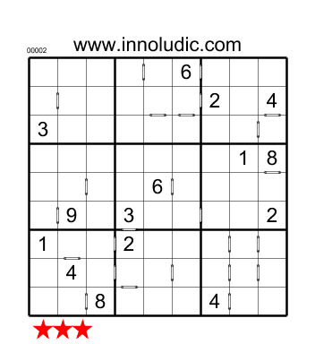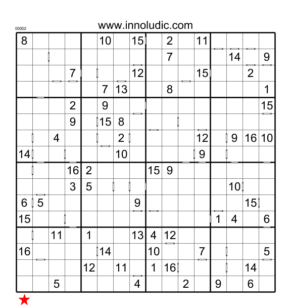 Voici deux Sudoku Consécutif en deux formats: Le Super 16x16 et l'usuel à 9x9. La seule particularité supplémentaire du consécutif est que lorsque deux cases sont séparée par une barre (en blanc) alors les deux nombres doivent avoir une différence de 1 ( d'où le nom de consécutif). Par exemple une case qui a une barre et a le nombre 5 alors l'autre case qui partage la barre devrait avoir soit 4 ou 6. Par le fait même toutes les paires de cases qui n'ont pas de barres ont une différence de plus de un.