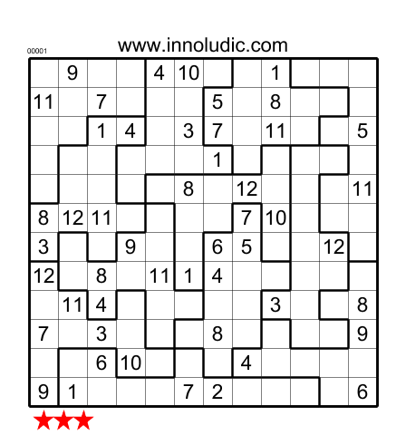 Voici deux Sudoku Chaos de tailles différentes. Le premier est de taille usuel soit 9x9 avec 9 rangées,colonnes et regions. Le secopnd est de taille 12x12 avec 12 rangées, colonnes et régions. Pour ce dernier jeu vous utilisez les nombres de 1 à 12.
