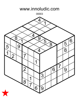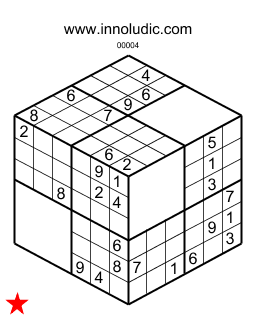 Le Sudokube (Règles du Sudokube) fait partie de la famille des Sudoku en trois dimensions. Ce jeu est un Sudoku qui est inscrit sur les trois face visibles d'un cube. Pour adapter un Sudoku classique ayant 9 régions (boite de 3x3) sur un cube ayant trois face de 4 régions il faut avoir une région vide sur chaque face. Pour suivre une rangée il faut sauter la région vide que parcourt cette même rangée. Vous utilisez les nombres de 1 à 9.