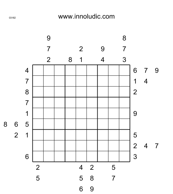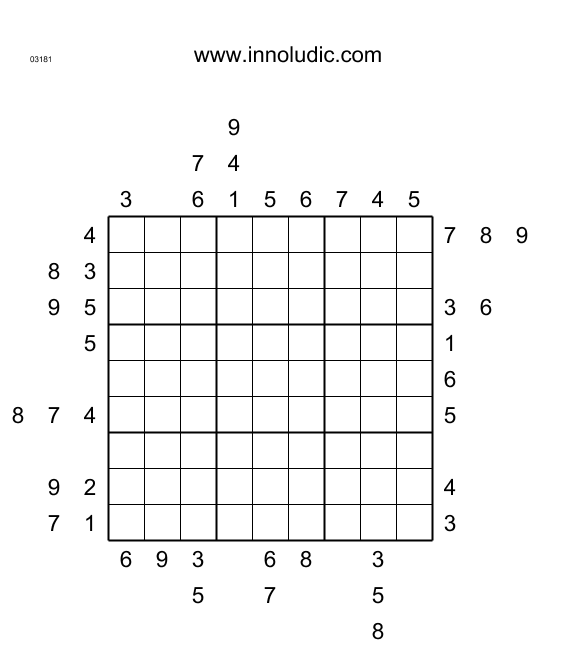 Les temps sont durs, confinés dans nos demeures, plusieurs d’entre nous rêvent d’évasion, d’êtres dehors. C’est pourquoi je vous présente des Sudoku Outside (Règles du Outside Sudoku). Les indices sont hors de la grille. Ils indiquent qu’ils sont présents dans les trois premières cases. Par exemple dans le premier jeu il y a en haut de la 4 ième colonne 9,4 et 1 alors ces chiffres dans l’orde sont dans les trois premières cases.
