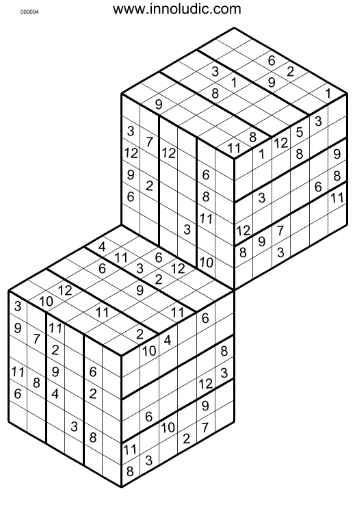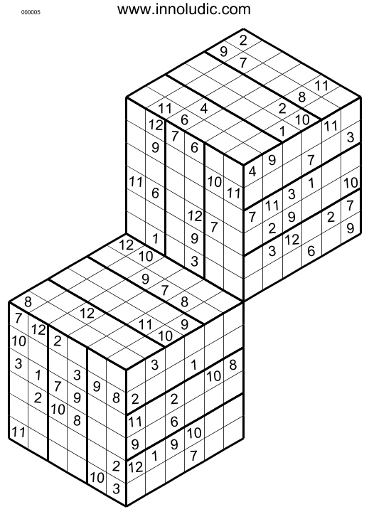 Voici deux Hyper Sudoku 3D (Règles du Sudoku 3D) de taille 8x8x8, il s'agit de deux cubes superposés, il vous faut donc utiliser les nombres de 1 à 12. La particularité de ce jeu est que les colonnes at rangées occupent deux faces d'un cubes et que de plus certaines colonnes et rangées occupent aussi deux face de deux cubes différents. Voilà, cela en fait de parfaits compagnons pour stimuler vos neuronnes.