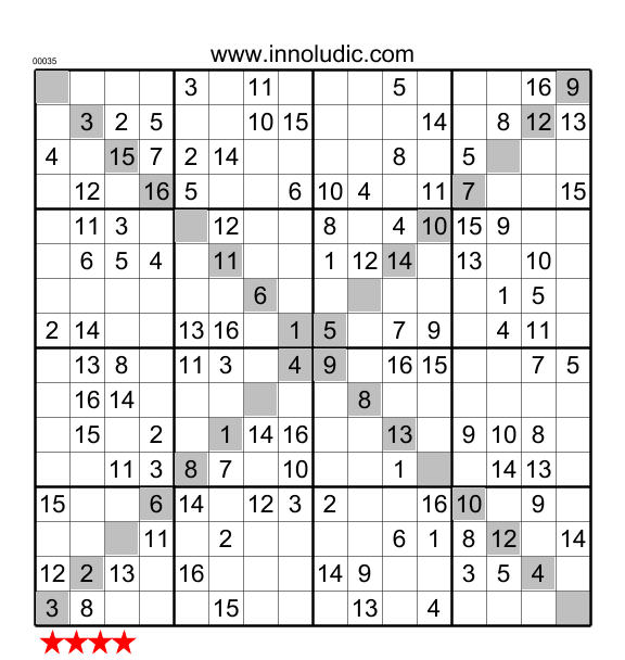 Déjà, un Super Sudoku 16x16 ne se résout pas facilement, mais un moyen d’alléger la tâche est d’ajouter une contrainte supplémentaire qui nous aide à réduire le nombre de possibilités. Donc la contrainte supplémentaire de ce Super Sudoku est que les deux grandes diagonales (cases grises) doivent contenir les nombres de 1 à 16. Autrement dit c’est un Super Sudoku X. Allez amusez-vous