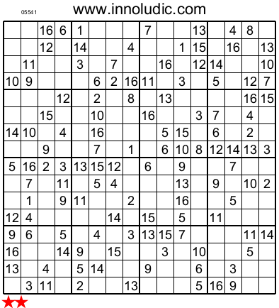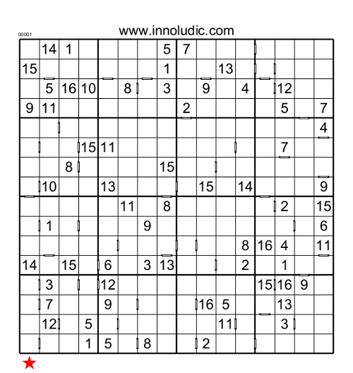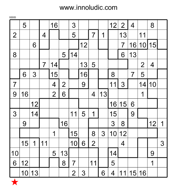 Voici le premier d<une s/rie de variation sur le theme du Super Sudoku 16X16: Il s'agit du Super Sudoku Chaos. Au lieu d'avoir des région régulières de taille 4x4 ce jeu a des régions de tailles irrégulières. Au début vous risquez d'être déconcerté, mais allez cela va passer !. Il s'agit du premier jeu d'une série sur des variations sur le Super Sudoku.