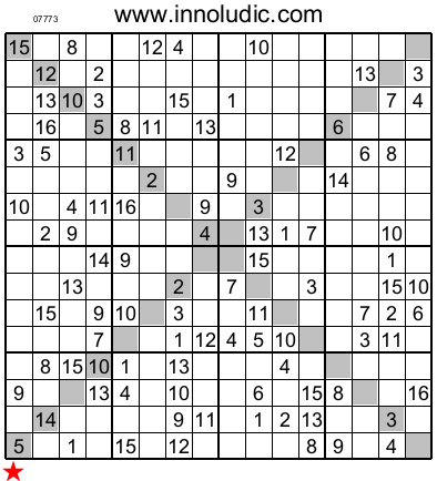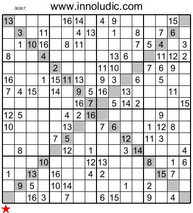 Toujour dans la veine des variation du Super Sudoku, voici le Sudoku X. Comme vous le remarquez: il y a deux diagonales (les cases en gris). Il faut que ces diagonales contiennent tous les nombres de 1 à 16. Pour le reste tout est pareil: il faut avoir les nombres de 1 à 16 dans chaque rangée, colonne et région. En voici deux pour vous amuser.