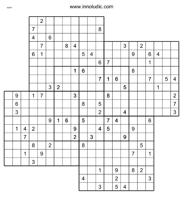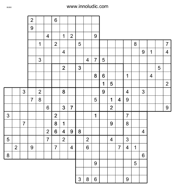 Voici, pour votre bon plaisir 2 Multi-Sudoku, ayant chacun 5 Sudokus. Ce sont des Windmill Sudoku (moulin-a-vent) problablement nommé ainsi en raison de leurs formes.