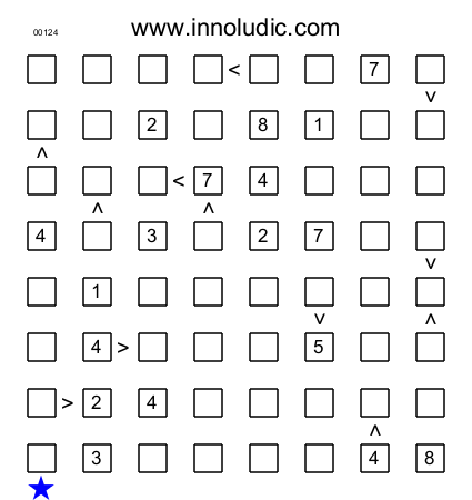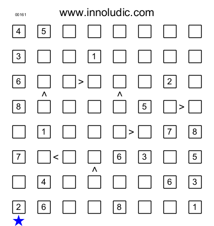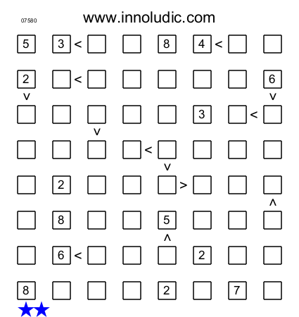 Voici des Futoshiki de taille 8X8. Il s'agit de placer les nombres 1 à 8 dans chaque colonnes et rangées, de plus il faut respecter les signes plus grand > et plus petit <. Bon vous en savez assez, lancez-vous à l'eau.