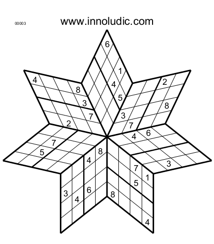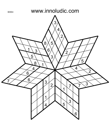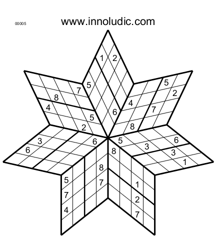 Il est plus que probable que la seule place où vous avez vue cette variante de Sudoku est ici. Le Spark Sudoku (Règles du Spark Sudoku) est inusité, au leiu d'avoir une forme en carré (l'usuel 9X9) il est en forme d'étoile qui peut avoir 5 à 8 branches. Il faut placer les nombres 1 à 8 dans chaque rangé, colonne et région. En voici 3 ayant chacun 7 branches (des heptagrammes).