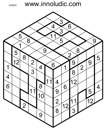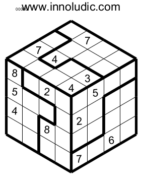 Pourquoi ne pas résoudre des Sudoku 3D ? Je vous le demande comme cela, parce que ce jeu nous force à penser "outside the box" (en fait c'est autour de la boite). Le Sudoku 3D est une agréable diversion au Sudoku classique car vous devez tenir compte de la forme du cube pour placer vos chiffres ( Règles du Sudoku 3D). En voici deux chacun ayant des régions irrégulières (pour vous déstabiliser un peu plus). Le premier est de taille 4x4x4 (don utilisez les nombres 1 à 8).