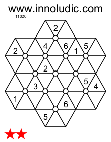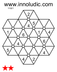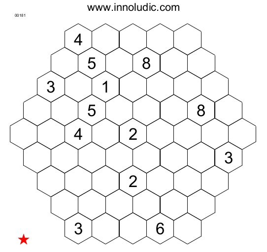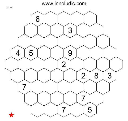 La caractéristique du Hanidoku (Règles du Hanidoku)est la forme hexagonale de sa grille contrairement aux autres jeux, comme le Sudoku, le Suguru, etc.., qui ont des formes rectangulaires. Ce qui permet de penser autrement, car chaque case fait partie d’une rangée et de deux diagonales. Voici donc deux jeux :