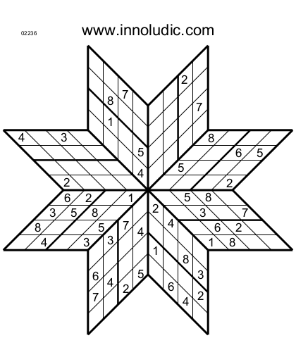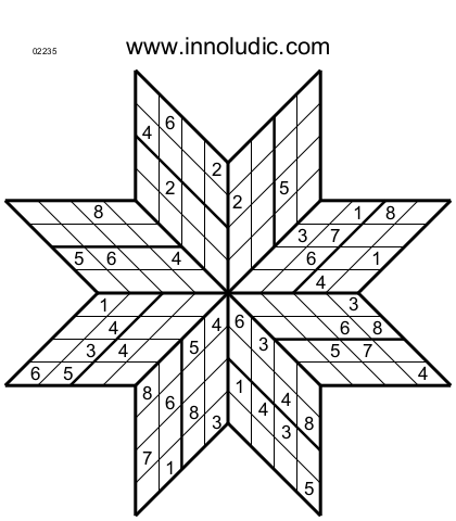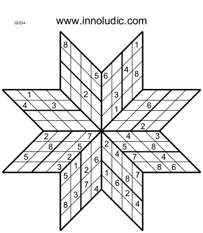 Le temps est venu de faire des Spark Sudokus, cela tombe bien en voici 3 (Règles du Spark Sudoku). Utilsisez les nombres 1 à 8. Comme les étoiles ont 8 branches, ce sont donc des octogrammes.
