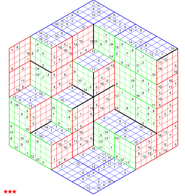 Mes visiteurs connaissent le Sudoku trois Dimensions (Règles du Sudoku 3 Dimensions). Récemment j'ai ajouté une version de ce jeu basé sur le Super Sudoku (Sudoku 16X16), poétiquement je nomme ce jeu: Super Sudoku Trois Dimensions. Ce jeu peut avoir 232 847 configurations différentes tandis que le Sudoku trois Dimension a seulement 979 configurations. Juste pour faire le tour des différentes configurations de ce jeu, il faut pas mal de temps !. Cela donne des jeux plus variés et aussi par le fait même plus exigeant à résoudre.