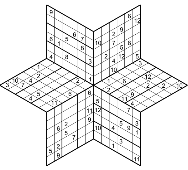Voici une nouvelle versionde Sudoku appelée Flocon Sudoku a cause d'une vague ressemblance avec un flocn de neige (en réalité chaque flocon ont une forme unique). Vous pouves voir les régles (Règles du Flocon Sudoku) . Pour cette première je vous offre des jeux dans les deux format (moyen et Jumbo).
