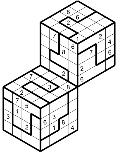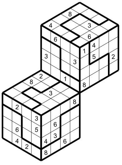 Voici deux Hyper Sudoku avec des régions irrégulières (Règles du Sudoku 3D). N'oubliez pas d'utiliser les chiffres 1 à 8.