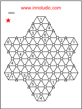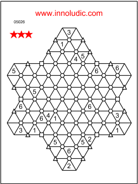 Pour aider à savoir de quel type d’hexagone il s’agit (dans le super sudoku flocon), j’ai ajouté des symboles dans le centre des hexagones. Les hexagones complets ont un cercle au centre (tout comme pour le flocon et le géant), les hexagones partiels de 4 cases ont tous un carré (4 côtés) au centre et finalement les hexagones partiels à 3 cases ont un triangle (trois côtés).