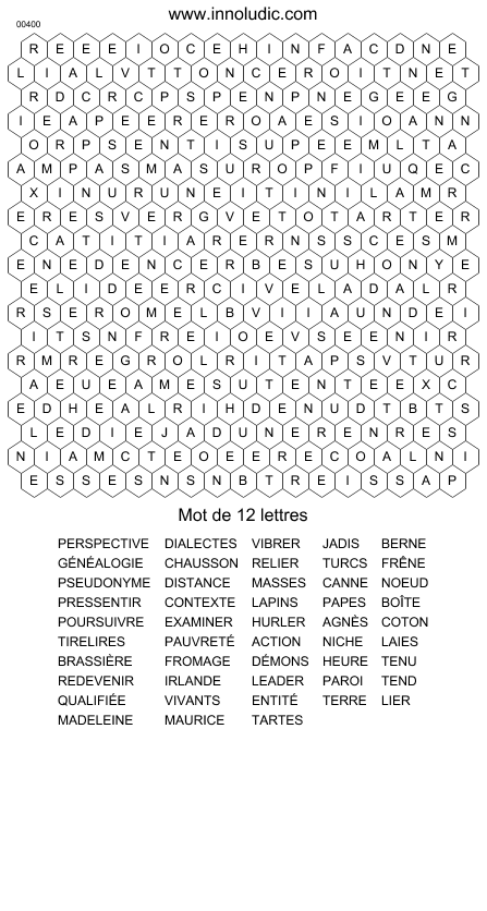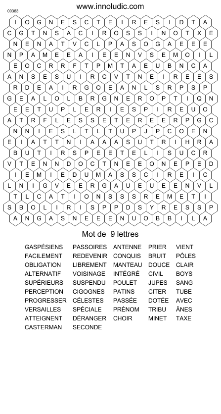 Cette année j’ai ajouté de la variété dans les formats de Mots Abeille, j’ai ajouté des grilles géantes pour combler les adeptes de ce jeu. Les règles sont les mêmes que le Mot caché, il suffit de trouver le mot dans la grille après avoir trouvé tous les mots de la liste. Les seules différences : les cases de la grille sont hexagonales (6 côtés) et les mots sont sinueusement inscrits dans la grille et finalement aucune lettre d’un mot n’est commune avec un autre mot dans la grille.