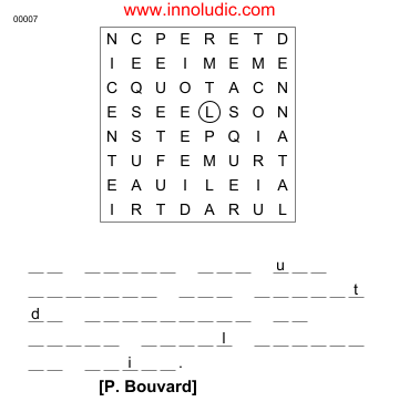 Voici le Dédalettre. Un jeu où il faut retracer une citation au travers d’un dédale de lettres. Certaines lettres de la citation sont déjà dévoilées et la première lettre est encerclée. Vous devez parcourir toutes les lettres une à une, et cela d’une lettre à une autre immédiatement adjacente. Bon, déduction, labeur et plaisir sont au rendez-vous !